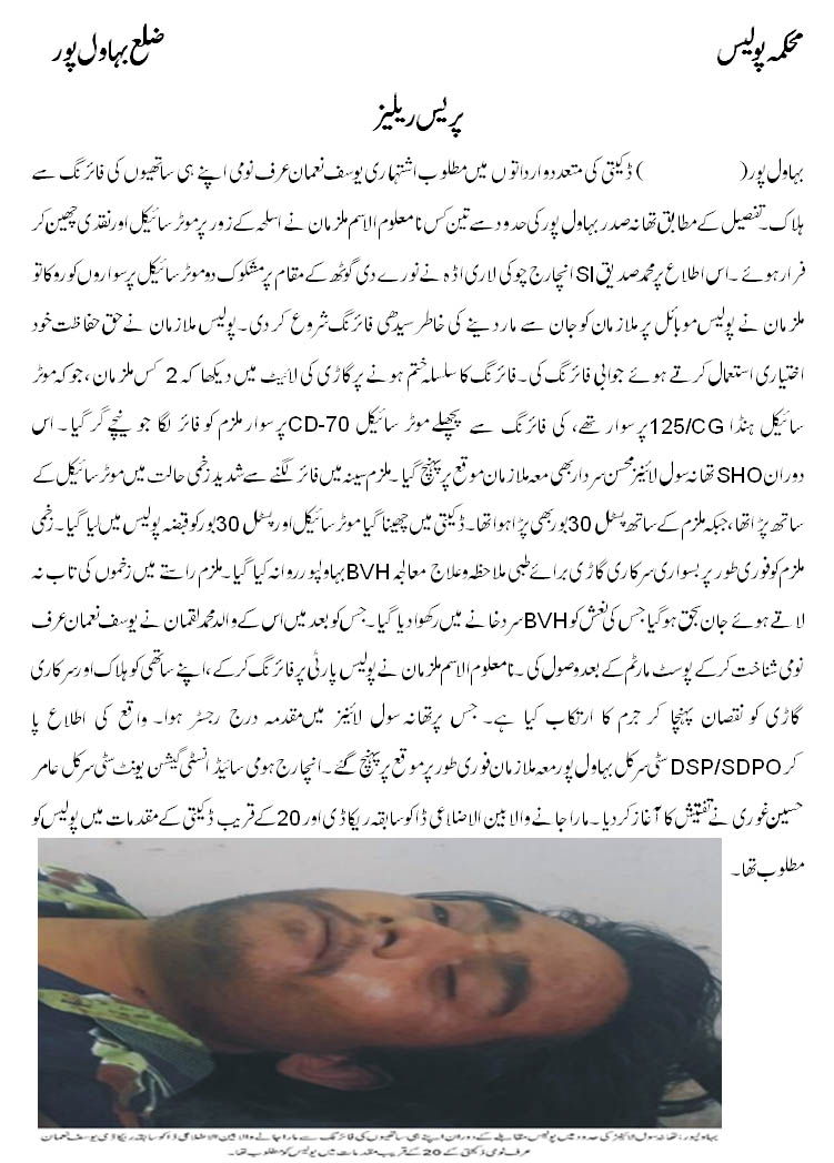 ۔ڈکیتی کی متعدد وارداتوں میں مطلوب اشتہاری یوسف نعمان عر نومی اپنے ہی ساتھیوں کی فائرنگ سے ہلاک