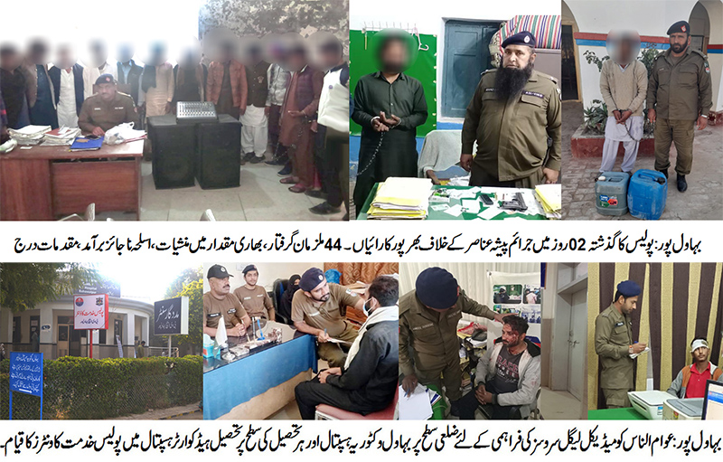 بہاول پور()ایڈیشنل انسپکٹر جنرل پولیس جنوبی پنجاب کی ہدایت پرڈسٹرکٹ پولیس آفیسرعبادت نثار کی زیرنگرانی میں جرائم پیشہ عناصر کے خلاف بھرپور کارائیاںجاری، بہاولپورپولیس کی گذشتہ 02 روز میں منشیات فروشوں اور اسلحہ ناجائز رکھنے والوں کے خلاف مختلف کارروائیاں۔ 44 ملزمان گرفتار،02کلوکے قریب چرس،500لیٹر کے قریب شراب اورناجائز اسلحہ برآمد،ملزمان گرفتار،مقدمات درج،جرائم پیشہ عناصر کا قلع قمع کرنے کا تہیہ کیا ہوا ہے، معاشر ے کو ایسے عناصر سے پاک کیا جائے گا،ڈی پی اوعبادت نثار۔