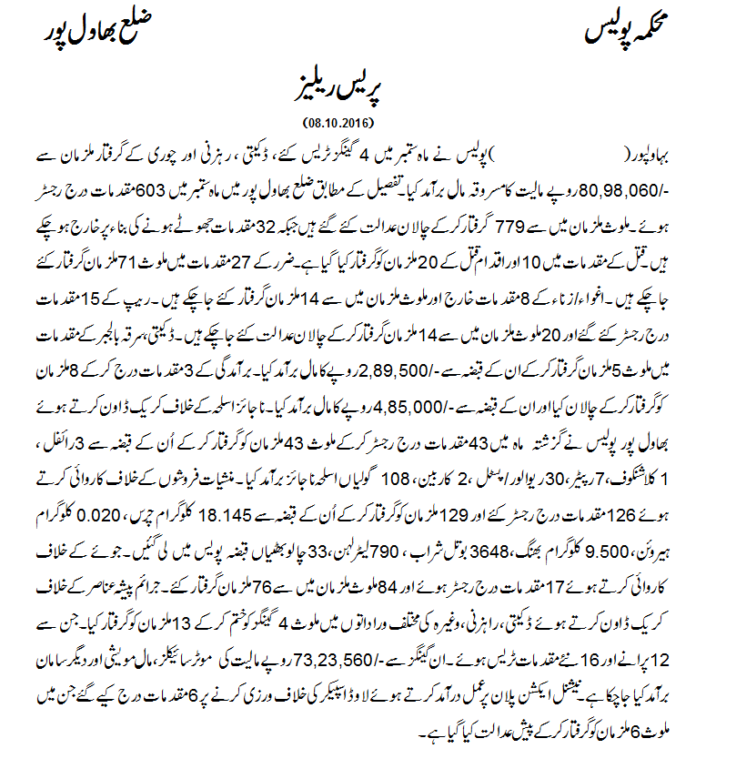 پولیس نے ماہ ستمبر میں 4گینگز ٹریس کیے،ڈکیتی رہزنی اور چوری کے کے گرفتار ملزمان سے 8098060روپے مالیت کا مسروقہ مال برآمد کیا گیا