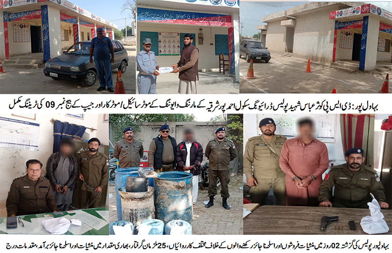 تفصیلات کے مطابق یڈیشنل انسپکٹر جنرل پولیس جنوبی پنجاب ڈاکٹر احسان صادق کی کمپئین پر ڈسٹرکٹ پولیس آفیسرعبادت نثار کی سر براہی میں اور تمام ایس ڈی پی اوز کی زیر نگرانی تمام ایس ایچ اوز نے ضلع بہاولپورمیں منشیات اور شراب فروشوں کے خلاف گرینڈ کریک ڈان جاری۔ بہاول پورپولیس جرائم پیشہ عناصرکے خلاف کارروائیاں جاری رکھے ہوئے ہے۔ تھانہ صدربہاولپور، عباسنگر، نوشہرہ جدید، ڈیراور اور خیرپورٹامیوالی پولیس نے منشیات فروشوں کے خلاف کارروائیاں کرتے ہوئے06 ملزمان کو گرفتارکرکے قبضہ سے03کلو140 گرام چرس اور 105گرام آئس برآمدکرلی۔ تھانہ کینٹ ، بغداد الجدید، صدر بہاولپور، صدراحمدپورشرقیہ، عنائتی اور عباسنگر نے شراب فروشوں کے خلاف کارروائیاں کرتے ہوئے07 ملزمان کو گرفتارکرکے ان کے قبضہ سے345 لیٹر دیسی شراب200 لیٹر لہن و چالو بھٹی برآمد کر لی۔تھانہ بغداد الجدید، ہیڈراجکاں ، صدر بہاولپور، سٹی حاصلپور، اوچ شریف ، نوشہرہ جدید اور صدر حاصلپور پولیس نے اسلحہ نا جائز رکھنے والوں کے خلاف کاروائی کرتے ہوئے 12 ملزمان کو گرفتار کر کے قبضہ سے08 عدد پسٹل 30 بور، 03عدد ریوالور32بور اور 01عدد رپیٹر 12بور برآمد کرلیا۔ متعلقہ پولیس نے ملزمان کے خلاف الگ الگ مقدمات درج کر لیے،ڈی پی او نے اپنے پیغام میں کہا کہ جرائم پیشہ عناصر کے خلاف کارروائیاں جاری رکھتے ہوئے مزید بڑی کارروائیاں کریںتاکہ بہاول پور منشیات جیسی لعنت سے پاک کیا جاسکے۔کسی مشکوک سرگرمی کی صورت میں پولیس ہیلپ لائن 15پر کال کر کے اطلاع دیں اور ذمہ دار شہری ہونے کا ثبوت دیں۔