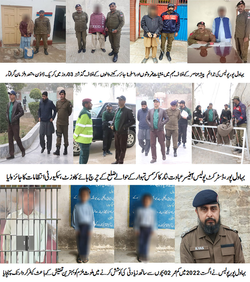 تفصیلات کے مطابق ایڈیشنل انسپکٹر جنرل پولیس جنوبی پنجاب کی جرائم پیشہ عناصرکے خلاف مہم پر ڈسٹرکٹ پولیس آفیسرعبادت نثار کی سر براہی میں اور تمام ایس ڈی پی اوز کی زیر نگرانی تمام ایس ایچ اوز نے ضلع بہاولپورمیں منشیات اور شراب فروشوں کے خلاف گرینڈ کریک ڈان جاری۔ بہاول پورپولیس جرائم پیشہ عناصرکے خلاف کارروائیاں جاری رکھے ہوئے ہے۔تھانہ کوتوالی ،چنی گوٹھ اورنوشہرہ جدید پولیس نے منشیات فروش کے خلاف کارروائی کرتے ہوئے ملزمان کو گرفتارکرکے قبضہ سے03کلو200گرام چرس و400گرام آئس برآمدکرلی۔ تھانہ کینٹ ، کوتوالی،صدر بہاولپور،سمہ سٹہ،سٹی احمدپور،چنی گوٹھ،عباسنگر ، مسافرخانہ ، ہیڈراجکاں، خیرپورٹامیوالی، دھوڑ کوٹ ، خیرپورٹامیوالی، سٹی حاصلپور اور صدر حاصلپور پولیس نے شراب فروشوں کے خلاف کارروائیاں کرتے ہوئے متعدد ملزمان کو گرفتارکرکے ان کے قبضہ سے741لیٹر دیسی شراب معہ 05عددچالو بھٹیاں برآمد کر لی۔تھانہ کوتوالی ، سمہ سٹہ ، دھوڑکوٹ ،سٹی یزمان،ڈیراوراور نو شہرہ جدید پولیس نے اسلحہ نا جائز رکھنے والوں کے خلاف کاروائی کرتے ہوئے متعدد ملزمان کو گرفتار کر کے قبضہ سے04عدد پسٹل30 بور، 01رپیٹر12بور,01عدد ریوالور32بور، 01عدد کلاشنکوف اور01عدد رائفل برآمد کر کے گرفتار کرلیا ۔ متعلقہ پولیس نے ملزمان کے خلاف الگ الگ مقدمات درج کر لیے،ڈی پی او نے اپنے پیغام میں کہا کہ جرائم پیشہ عناصر کے خلاف کارروائیاں جاری رکھتے ہوئے مزید بڑی کارروائیاں کریںتاکہ بہاول پور منشیات جیسی لعنت سے پاک کیا جاسکے۔کسی مشکوک سرگرمی کی صورت میں پولیس ہیلپ لائن 15پر کال کر کے اطلاع دیں اور ذمہ دار شہری ہونے کا ثبوت دیں۔