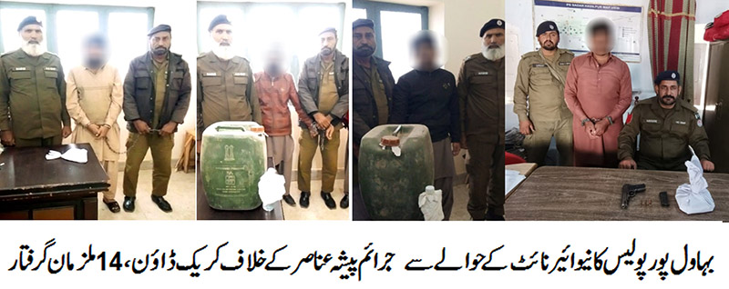 ڈی پی اوبہاول پورعبادت نثار کی ہدات پر بہاول پورپولیس کانیوائیر نائٹ کے حوالے سے جرائم پیشہ عناصر کے خلاف کریک ڈائون،14 ملزمان گرفتار،610 لیٹر شراب دیسی،420 لیٹرلہن ،03 چالوبھٹیاں شراب اوراسلحہ ناجائز برآمد ۔