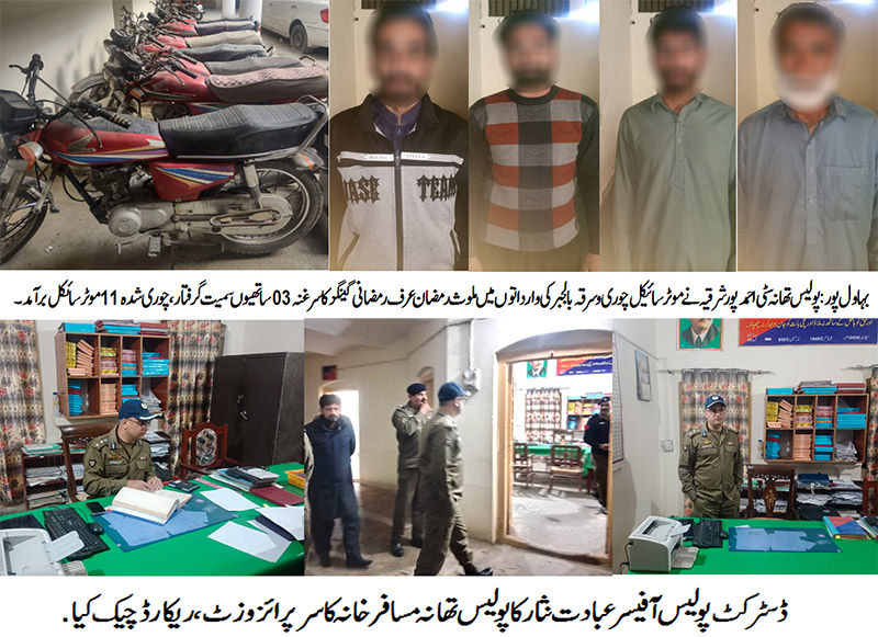 تفصیل کے مطابق انسپکٹر جنرل آف پولیس پنجاب اورایڈیشنل انسپکٹر جنرل آف پولیس جنوبی پنجاب کی '' عوام خدمت پالیسی '' کے تحت ڈسٹرکٹ پولیس آفیسر عبادت نثار کی قیادت اورکامیاب پولیسنگ کے تحت نتائج آنے کا سلسلہ جاری ہے، تھانہ سٹی احمدپور شرقیہ پولیس کی کامیاب کارروائی۔ اے ایس پی سرکل احمدپورشرقیہ کی سربراہی میں اور ایس ایچ اوتھانہ سٹی احمدپورشرقیہ سجاد احمدکی تفتیشی آفیسر سردار محمد سب انسپکٹر معہ ملازمان پر مشتمل ٹیم نے جدید ٹیکنالوجی کا سہارا لیتے ہوئے شب روز کی محنت سے موٹرسائیکل چوری اور سرقہ بالجبرکی متعددمقدمات میں ملوث رمضانی اور رمضانی گینگز کے سرغنہ کو03 ساتھی ملزمان سمیت گرفتارکرلیا،گرفتارملزمان میںرمضان ، جمعہ خان ، فہیم اور نبیل شامل ہیں۔ملزمان نے دوران اینٹروگیشن تھانہ احمدپورشرقیہ کے علاوہ ضلع مظفرگڑھ کی تحصیل علی پور اور پنجاب کے دیگر اضلاع میںبھی سرقہ بالجبرکے متعددمقدمات میں ملوث ہونے کااعتراف بھی کیا،جبکہ وارداتوں میں استعمال ہونے والاناجائزاسلحہ 04پسٹل30 بور برآمدکرکے الگ الگ مقدمات درج کرلیے۔ملزمان سے مزید اینٹروگیشن جاری ہے اوراہم انکشافات متوقع ہیں،ملزمان کی نشاندہی پرنقدی02لاکھ 05ہزار روپے سے زائداور 11عدد سرقہ شدہ موٹرسائیکل برآمدکرلیے، بازیافتہ مال مسروقہ کو قانونی طریقہ کار کے بعد اصل مالکان کے حوالے کردیاگیا،ڈی پی او نے اپنے پیغام میں کہا کہ بلا شبہ تھانہ سٹی احمدپورشرقیہ کی یہ ایک اہم کارروائی ہے ، بہاول پورپولیس شہریوں کی حفاظت کے لیے دن رات محنت کررہی ہے،اگر کوئی جرم سرزد ہوتا ہے تو اس کو ٹریس کرنا اور شہریوں کا لوٹا ہوا مال بر آمد کرناپولیس کے لیے ایک اہم ٹاسک ہوتا ہے۔