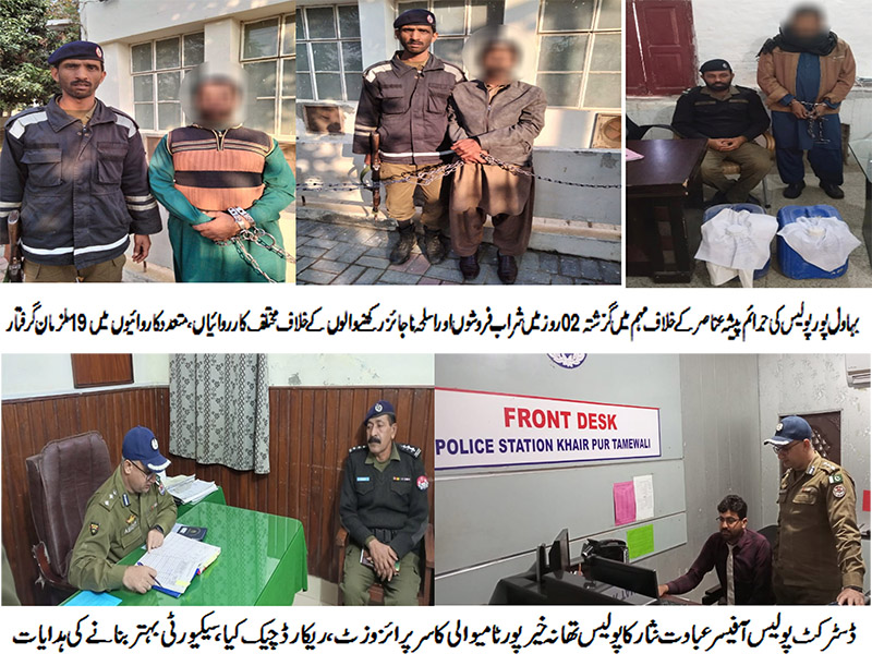 تفصیلات کے مطابق انسپکٹر جنرل پنجاب،ا یڈیشنل انسپکٹر جنرل پولیس جنوبی پنجاب کی جرائم پیشہ عناصر کے خلاف مہم پر ڈسٹرکٹ پولیس آفیسرعبادت نثار کی سر براہی میں اور تمام ایس ڈی پی اوز کی زیر نگرانی تمام ایس ایچ اوز نے ضلع بہاولپورمیں منشیات اور شراب فروشوں کے خلاف گرینڈ کریک ڈان جاری۔ بہاول پورپولیس جرائم پیشہ عناصرکے خلاف کارروائیاں جاری رکھے ہوئے ہے۔تھانہ قائمپور، سٹی احمد پور شرقیہ ،نوشہرہ جدید،سٹی حاصلپور،کوتوالی،سول لائنز،صدر بہاولپوراور خیرپور ٹامیوالی پولیس نے شراب فروشوں کے خلاف کارروائیاں کرتے ہوئے ملزمان کو گرفتارکرکے ان کے قبضہ سے605 لیٹر دیسی شراب و 440لیٹر لہن معہ 03عدد چالو بھٹیاں برآمد کر لی۔تھانہ قائمپور،کینٹ،سٹی حاصلپور اور عباسنگر پولیس نے اسلحہ نا جائز رکھنے والوں کے خلاف کاروائی کرتے ہوئے ملزمان کو گرفتار کر کے قبضہ سے04 عدد پسٹل 30 بور اور 01عدد پسٹل9 ایم ایم اوربندوق12بور برآمد کرلیا۔ متعلقہ پولیس نے ملزمان کے خلاف الگ الگ مقدمات درج کر لیے،ڈی پی او نے اپنے پیغام میں کہا کہ جرائم پیشہ عناصر کے خلاف کارروائیاں جاری رکھتے ہوئے مزید بڑی کارروائیاں کریں تاکہ بہاول پور منشیات جیسی لعنت سے پاک کیا جاسکے۔کسی مشکوک سرگرمی کی صورت میں پولیس ہیلپ لائن 15پر کال کر کے اطلاع دیں اور ذمہ دار شہری ہونے کا ثبوت دیں۔