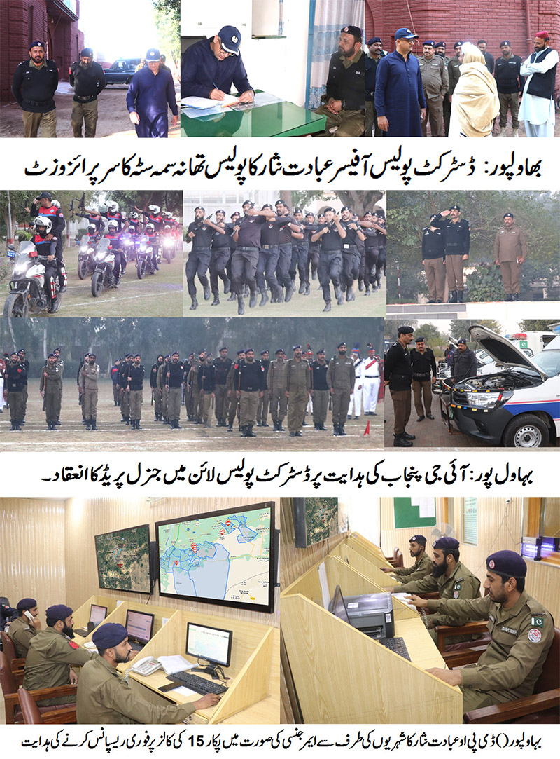 بہاول پور( ) آئی جی پنجاب کی ہدایت پر ڈسٹرکٹ پولیس لائن میں جنرل پریڈ کا انعقاد۔ پولیس کے چاق و چوبند دستے کی سلامی، اپنے فرائض کے ساتھ ساتھ فٹنس اور ڈسپلن پر خصوصی توجہ دی جائے، ڈی پی اوعبادت نثار۔