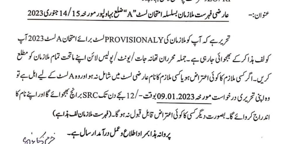 پروموشن لسٹ کے لیے ایک امتحان ڈسٹرکٹ پولیس لائنز بہاولپور میں 14.01.2023 سے 15.01.2023 تک منعقد ہوگا۔ آپ کے ایڈمنسٹریٹو کنٹرول کے تحت کام کرنے والے ڈسٹرکٹ کو براہِ کرم 13.01.2023 کو ڈسٹرکٹ پولیس لائنز بہاولپور میں شام کو رپورٹ کرنے کی ہدایت جاری ۔
