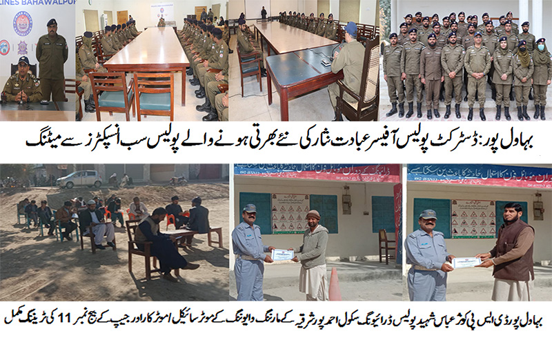 تفصیل کے مطابق محکمہ پولیس میںنئے بھرتی ہونے والے سب انسپکٹرز کے لئے ڈسٹرکٹ پولیس لائنز میں ایک تقریب کا انعقاد کیا گیا ڈسٹرکٹ پولیس آفیسر عبادت نثار نے پولیس لائنز بہاولپور میں نئے بھرتی ہونے والے پولیس سب انسپکٹرز کے ساتھ ملاقات کی۔ ڈی پی او نے نئے بھرتی ہونے والے سب انسپکٹرز کو مبارکباد دی اورمحکمہ پنجاب پولیس میں خوش آمدید کہا ۔اس موقع پر خطاب میں کہا کہ نوجوانوںکو قابلیت کی بنیاد پر محکمہ پولیس میں بطور سب انسپکٹرز بھرتی کیا گیاہے۔آپ پر فرض عائد ہوتا ہے کہ سچے دل کے ساتھ عوام الناس کی خدمت کریں اور جرائم کی روک تھام میں اپنا کردار ادا کریں ۔ ہم امید کرتے ہیں کہ میرٹ پر آنے والے یہ نوجوان سب انسپکٹرز ہمت، بہادری اور ایمانداری سے اپنے فرائض سرانجام دیکر اپنے ملک وقوم سمیت محکمہ پولیس کا نام بھی روشن کریں گے۔اس موقع پر نئے بھرتی ہونے والے سب انسپکٹرز نے اس بات کا عہد کیا کہ ہم عوام الناس کے جان و مال کی حفاظت اور معاشرے میں قیام امن کو یقینی بنانے کے لیے اپنا بھرپور کردار ادا کریں گے۔