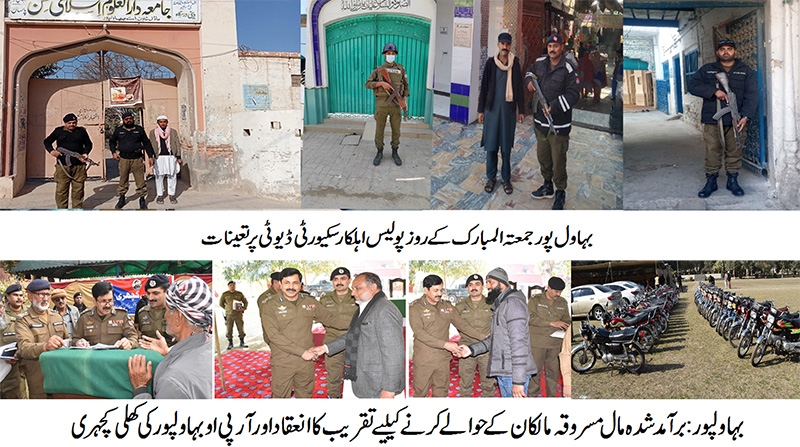 تفصیل کے مطابق انسپکٹرجنرل آف پولیس پنجاب اورایڈیشنل انسپکٹرجنرل آف پولیس جنوبی پنجاب کے احکامات کی روشنی میں ڈی پی اوعبادت نثار کی ہدایت پر عمل پیرا ہوتے ہوئے ایس ڈی پی اوزنے اپنے سرکل جبکہ ایس ایچ اوزنے اپنے تھانہ جات کی حدودمیں جمعتہ المبارک کے حوالے سے مساجداوراما م بارگاہوں کی سیکیورٹی ڈیوٹی پرمامورافسران واہلکاران کوچیک کیا۔سیکیورٹی اہلکاروں کے پاس موجود اسلحہ اورحفاظتی انتظامات کا جائزہ لیا۔جوانوں کو الرٹ رہ کر ڈیوٹی سرانجام دینے کی ہدایت کی۔ڈی پی اوعبادت نثار نے اپنے پیغام میں کہا ہے کہ ہمارا فرض بہت اہم ہے،شہریوں کو احساس تحفظ دلانا ہے کہ ہم انکی سیکیورٹی کے لیے موجودہیں۔ملکی صوتحال کے پیش نظر شرپسند عناصر پر کڑی نظر رکھیں اورالرٹ رہیں کیونکہ ہم الرٹ رہیں گے تو شرپسند عناصراپنے مذموم مقاصد میں کامیاب نہیں ہوسکے گے، انہوں نے ایس ڈی پی او ز اورایس ایچ اوز کو اپنے اپنے ایریا میں مؤثر گشت اورسیکیورٹی انتظامات کے حوالے سے ہدایات بھی جاری کیں۔