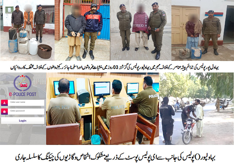 تفصیلات کے مطابق انسپکٹر جنرل پنجاب اورایڈیشنل انسپکٹر جنرل پولیس جنوبی پنجاب کی جاری کردہ مہم پر ڈسٹرکٹ پولیس آفیسرعبادت نثار کی سر براہی میں اور تمام ایس ڈی پی اوز کی زیر نگرانی تمام ایس ایچ اوز نے ضلع بہاولپورمیں منشیات اور شراب فروشوں کے خلاف مہم جاری۔ بہاول پورپولیس جرائم پیشہ عناصرکے خلاف کارروائیاں جاری رکھے ہوئے ہے۔ تھانہ ڈیرہ نواب صاحب،کینٹ،سٹی یزمان،صدر یزمان اورڈیراور پولیس نے منشیات فروش کے خلاف کارروائی کرتے ہوئے05عدد ملزمان کو گرفتارکرکے قبضہ سے4کلو170 گرام چرس برآمدکرلی۔ تھانہ صدر احمدپور شرقیہ،نوشہرہ جدید،ڈیرہ نواب صاحب اور خیرپور ٹامیوالی پولیس نے شراب فروشوں کے خلاف کارروائیاں کرتے ہوئے 06عددملزمان کو گرفتارکرکے ان کے قبضہ سے320 لیٹر دیسی شراب و لہن115لیٹر اور02عدد چالو بھٹیاںبرآمد کر لی۔تھانہ ڈیرہ نواب صاحب،کوتوالی اور مسافر خانہ پولیس نے اسلحہ نا جائز رکھنے والوں کے خلاف کاروائی کرتے ہوئے03عدد ملزمان کو گرفتار کر کے قبضہ سے01عدد پسٹل 30 بور اور 02عدد ریوالور 32بور برآمد کرلیا۔تھانہ صدر احمد پور شرقیہ اوربغداد الجدید پولیس نے جوا کھیلنے والے 11ملزمان کو گرفتار کر کے ان کے قبضے سے دائو پر لگی رقم برامد کر لی۔ متعلقہ پولیس نے گرفتار ملزمان کے خلاف الگ الگ مقدمات درج کر لیے،ڈی پی او نے اپنے پیغام میں کہا کہ جرائم پیشہ عناصر کے خلاف کارروائیاں جاری رکھتے ہوئے مزید بڑی کارروائیاں کریںتاکہ بہاول پور منشیات جیسی لعنت سے پاک کیا جاسکے۔کسی مشکوک سرگرمی کی صورت میں پولیس ہیلپ لائن 15پر کال کر کے اطلاع دیں اور ذمہ دار شہری ہونے کا ثبوت دیں۔