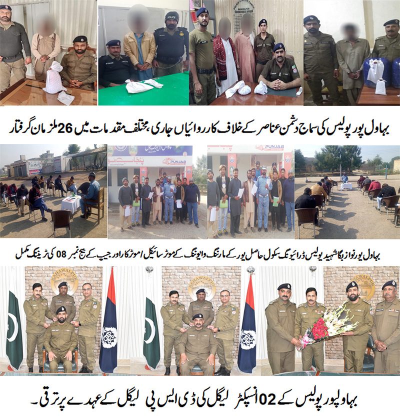 بہاول پور()پولیس کی سماج دشمن عناصر کے خلاف کارروائیاں جاری ،26ملزمان گرفتار، منشیات اور ناجائزاسلحہ رکھنے والوں سے 03کلو سے زائد چرس،460لیٹر دیسی شراب و 40لیٹر لہن معہ 02عددچالو بھٹیاں برآمد،08 پسٹل 30بوراور 01ریوالور 32بور برآمد، مقدمات درج، دستیاب وسائل کو بروئے کارلاتے ہوئے معاشرے کو منشیات فروشوں سے پاک کیاجائے گا، ڈسٹرکٹ پولیس آفیسرعبادت نثار۔