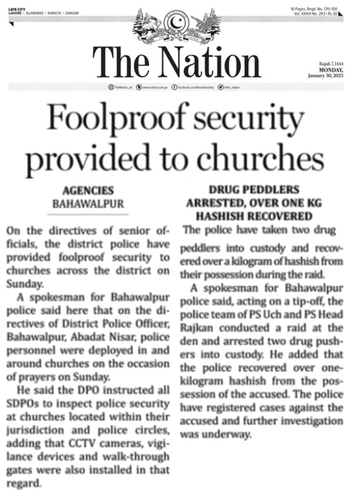 BAHAWALPUR - On the directives of senior officials, the district police have provided foolproof security to churches across the district on Sunday.
