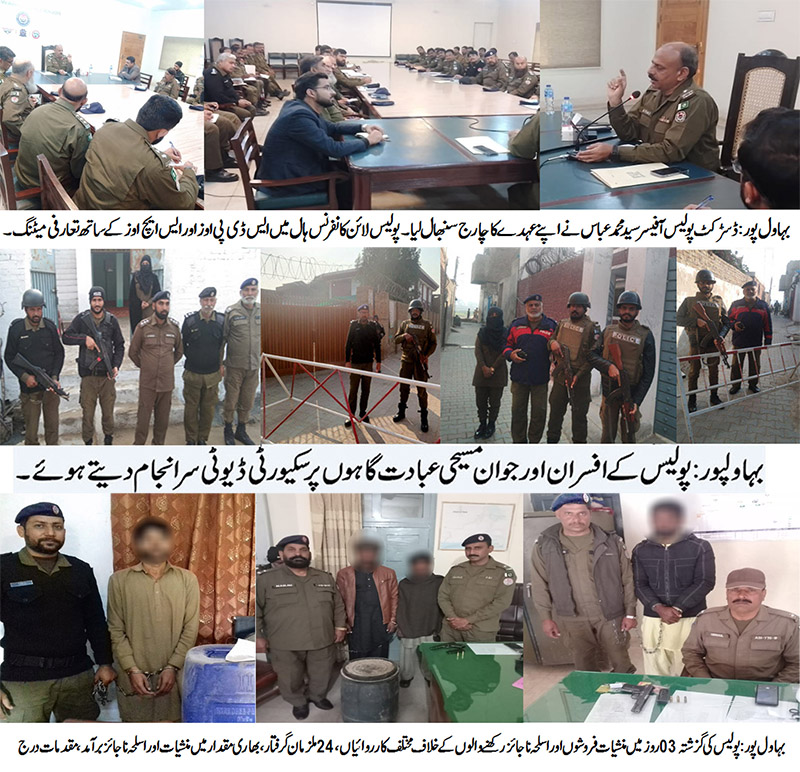 تفصیلات کے مطابق انسپکٹر جنرل پنجاب اورایڈیشنل انسپکٹر جنرل پولیس جنوبی پنجاب کی جاری کردہ مہم پر ڈسٹرکٹ پولیس آفیسرسید محمد عباس کی سر براہی میں اور تمام ایس ڈی پی اوز کی زیر نگرانی تمام ایس ایچ اوز نے ضلع بہاولپورمیں منشیات اور شراب فروشوں کے خلاف مہم جاری۔ بہاول پورپولیس جرائم پیشہ عناصرکے خلاف کارروائیاں جاری رکھے ہوئے ہے۔ تھانہ ہیڈراجکاں اور عنائتی پولیس نے منشیات فروش کے خلاف کارروائی کرتے ہوئے04ملزمان کو گرفتارکرکے قبضہ سے810 گرام چرس برآمدکرلی۔ تھانہ عنایتی ، سٹی حاصلپور، سمہ سٹہ ، اور ہیڈراجکاں پولیس نے شراب فروشوں کے خلاف کارروائیاں کرتے ہوئے 06عددملزمان کو گرفتارکرکے ان کے قبضہ سے277 لیٹر دیسی شراب برآمد کر لی۔تھانہ سمہ سٹہ ، سٹی حاصلپور، کینٹ، بغداد الجدید، اوچ شریف، عنائتی ، خیرپورٹامیوالی اور صدر احمدپورشرقیہ پولیس نے اسلحہ نا جائز رکھنے والوں کے خلاف کاروائی کرتے ہوئے14 ملزمان کو گرفتار کر کے قبضہ سے13عدد پسٹل 30 بور اور01عدد رپیٹر 12بور برآمد کرلیا۔۔ متعلقہ پولیس نے گرفتار ملزمان کے خلاف الگ الگ مقدمات درج کر لیے،ڈی پی او نے اپنے پیغام میں کہا کہ جرائم پیشہ عناصر کے خلاف کارروائیاں جاری رکھتے ہوئے مزید بڑی کارروائیاں کریںتاکہ بہاول پور منشیات جیسی لعنت سے پاک کیا جاسکے۔کسی مشکوک سرگرمی کی صورت میں پولیس ہیلپ لائن 15پر کال کر کے اطلاع دیں اور ذمہ دار شہری ہونے کا ثبوت دیں۔