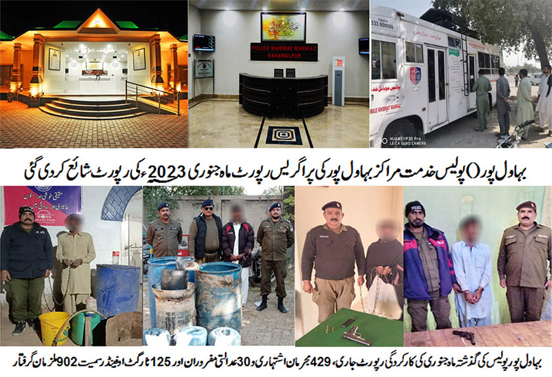 تفصیلات کے مطابق بہاول پورپولیس نے ماہ جنوری2023کے مہینہ میں1184مقدمات درج رجسٹر کیے، جن میں سے10 مقدمات جھوٹے ہونے کی بناء پر خارج ہو چکے ہیں، جن سے16 نئے اور پرانے مقدمات ٹریس آوٹ اور ناجائز اسلحہ برآمدکرنے علاوہ 18583789-روپے سے زائدمالیت کا مال مسروقہ و نقدی برآمد ہوا۔ ناجائز اسلحہ کے خلاف کریک ڈاؤن کرتے ہوئے71 مقدمات درج اور71ملزمان کو گرفتارکر کے اُن کے قبضہ سے 02 عددرائفل،02رپیٹر،03عدد کاربین ،03بندوق55پسٹل اور06ریوالوراور219روندبرآمد ہوئے۔منشیات فروشوں کے خلاف بھر پور کارروائیاں کرتے ہوئے131مقدمات درج کرکے ان میں ملوث134ملزمان کو گرفتار کرکے اُن کے قبضہ سے 33 کلو750 گرام چرس،50 گرام آئس،292کلو400گرام بھنگ،4549لیٹر شراب،775لیٹر لہن اور19 چالو بھٹیاں شراب قبضہ پولیس میں لی گئیں۔ قماربازوں کے خلاف کارروائیاں کرتے ہوئے18مقدمات درج کرکے 74 جواریوں کو گرفتار کرکے دائو پر لکی روقم اور جوئے کا سامان برآمدکیا۔ نیشنل ایکشن پلان پر عمل درآمد کرتے ہوئے ساؤنڈ سسٹم ایکٹ کی خلاف ورزی کرنے پر14، عارضی رہائش کے10، بجلی چوری کے10، گیس ری فلنگ کے05 ملزمان کو گرفتار کرکے پیش عدالت کیا جا چکا ہے۔مجرمان اشتہاریوں کے خلاف کریک ڈاؤن کرتے ہوئے ضلع بھر کی پولیس نے''اے'' کیٹگری کے27اور ''بی'' کے402 سمیت429مجرمان اشتہاری کے علاوہ کیٹگری "بی"کے 30عدالتی مفروران سمیت 125ٹارگٹ اوفینڈر کو بھی کو گرفتار کرکے چالان عدالت کیا، ڈی پی اوسید محمد عباس نے ماہ جنوری2023 کی کارگزاری کے حوالے سے بات کرتے ہوئے کہا کہ شہریوں کا پولیس سے تعاون/ اطلاع دینے پر مزیدجرائم پیشہ عناصرکوقابو کرنے سے جرائم میں کمی ہوسکتی ہے، شہری معاشرتی امن کی راہ میں رکاوٹ بننے والوں کی نشاندہی کریں پولیس ہرصورت ایسے عناصر کو جیل کی سلاخوں کے پیچھے پہنچا ئے گی۔