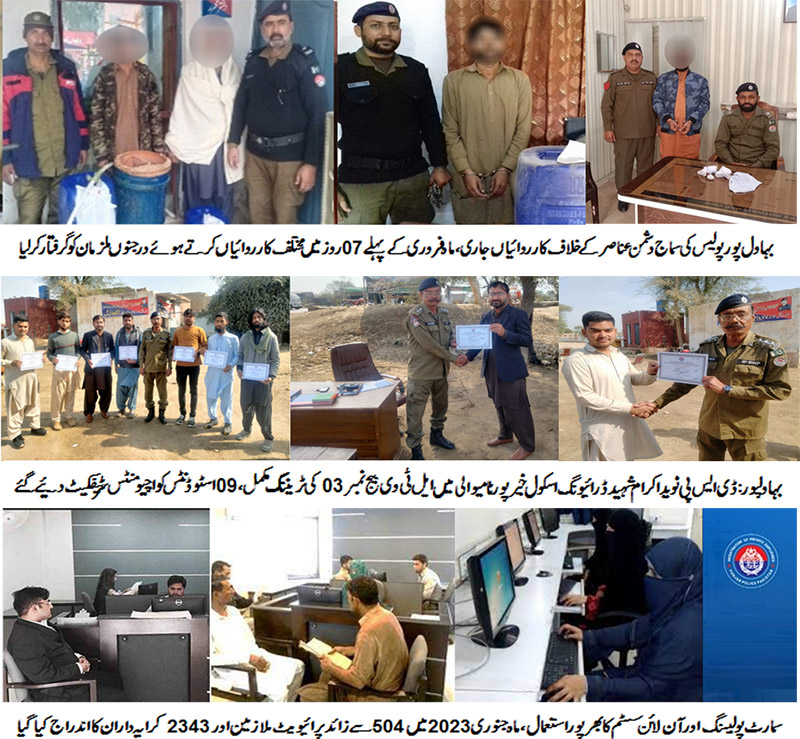 بہاول پور پولیس جرائم پیشہ عناصر پر قابو پانے کے لئے تکنیکی بنیادوں پر بھی متحرک، سمارٹ پولیسنگ اور آن لائن سسٹم کا بھرپور استعمال،ماہ جنوری 2023میں504سے زائد پرائیویٹ ملازمین اور 2343 کرایہ داران کا اندراج کیا گیا ۔ڈی پی او سید محمد عباس کے حکم پر رہائش گاہوں ، کاروباری مراکز اور فیکٹریوں میں کام کرنے والے پرائیویٹ ملازمین کی رجسٹریشن مہم جاری ، شہریوں کی حفاظت اور کرائم کنٹرول میں سول سوسائٹی کا پولیس کے ساتھ تعاون نہایت ضروری ہے،اپنی ر ہائش گاہوں ، کاروباری مراکز اور فیکٹریوں پرپرائیویٹ ملازم رکھنے سے پہلے قریبی تھانے میں رجسٹریشن لازمی کروائیں تاکہ عوام الناس کا تحفظ یقینی بنایا جاسکے ڈی پی او سید محمد عباس۔