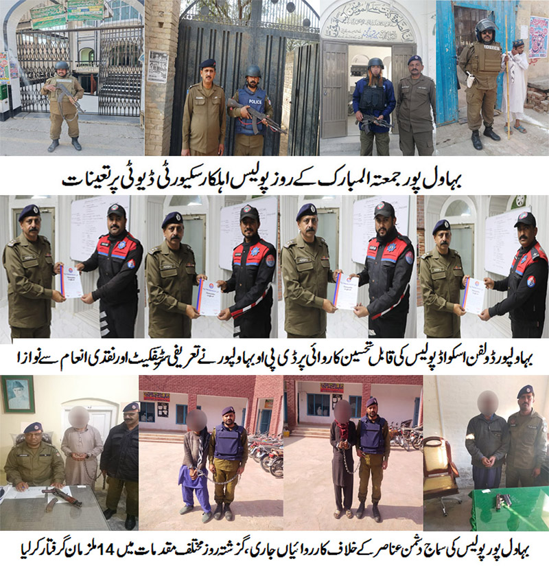 تفصیل کے مطابق انسپکٹرجنرل آف پولیس پنجاب اورایڈیشنل انسپکٹرجنرل آف پولیس جنوبی پنجاب کے احکامات کی روشنی میں ڈی پی اوسید محمد عباس کی ہدایت پر عمل پیرا ہوتے ہوئے ایس ڈی پی اوزنے اپنے سرکل جبکہ ایس ایچ اوزنے اپنے تھانہ جات کی حدودمیںجمعتہ المبارک کے حوالے سے مساجداوراما م بارگاہوں کی سیکیورٹی ڈیوٹی پرمامورافسران واہلکاران کوچیک کیا۔سیکیورٹی اہلکاروں کے پاس موجود اسلحہ اورحفاظتی انتظامات کا جائزہ لیا۔جوانوں کو الرٹ رہ کر ڈیوٹی سرانجام دینے کی ہدایت کی۔ڈی پی اوسید محمد عباس نے اپنے پیغام میں کہا ہے کہ ہمارا فرض بہت اہم ہے،شہریوں کو احساس تحفظ دلانا ہے کہ ہم انکی سیکیورٹی کے لیے موجودہیں۔ملکی صوتحال کے پیش نظر شرپسند عناصر پر کڑی نظر رکھیں اورالرٹ رہیں کیونکہ ہم الرٹ رہیں گے تو شرپسند عناصراپنے مذموم مقاصد میں کامیاب نہیں ہوسکے گے، انہوں نے ایس ڈی پی او ز اورایس ایچ اوز کو اپنے اپنے ایریا میں مؤثر گشت اورسیکیورٹی انتظامات کے حوالے سے ہدایات بھی جاری کیں۔
