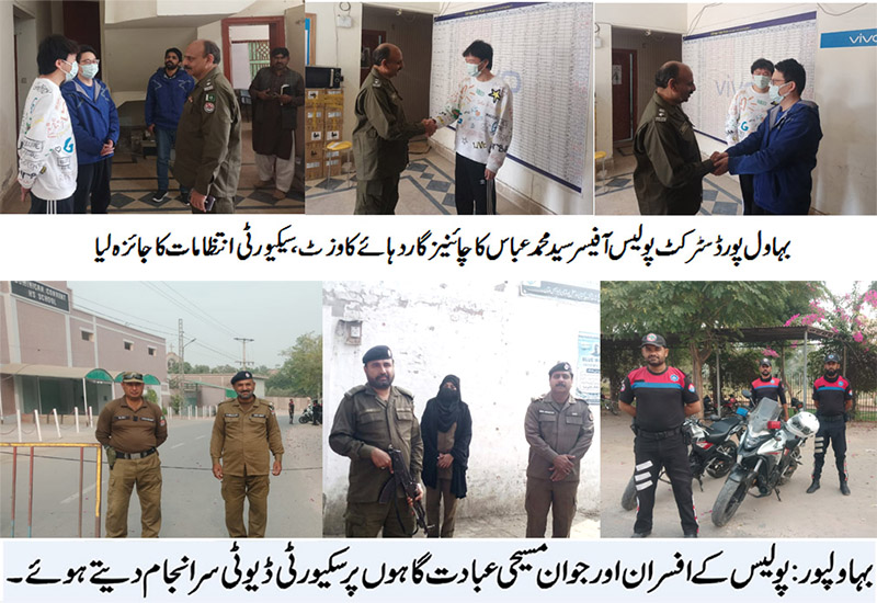بہاول پور( )ڈسٹرکٹ پولیس آفیسرسید محمد عباس کی ہدایت پرمسیحی عبادت گاہوں پرہونے والی عبادت کے حوالے سے سیکیورٹی کے سخت انتظامات، سینکڑوں پولیس افسران و اہلکار ڈیوٹی پر تعینات، متعلقہ ایس ڈی پی اوزاورایس ایچ اوزنے سیکیورٹی پلان کے مطابق پولیس افسران کو چیک کیا،مسیحی برادری سمیت تمام شہریوں کی حفاظت ہمارے اولین فرائض میں شامل ہے، ڈی پی او ۔