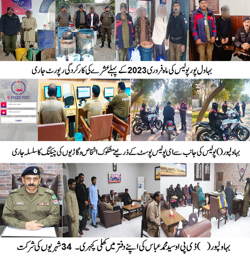 بہاول پور() پولیس کی ماہ فروری 2023 کے پہلے عشرے کی کارکردگی رپورٹ جاری،"بی" کیٹگری کے52 ملزمان سمیت 145 ملزمان گرفتار کرلیے ، 05 کلوگرام سے زائد چرس برآمد، شراب فروشوں کے خلاف ایکشن۔، اسلحہ ناجائز رکھنے والوں کے خلاف کاروائی کرتے ہوئے درجنوں ملزمان گرفتار، جرائم پر قابو پانے کے ساتھ ساتھ کمیونٹی پولیسنگ پر بھی توجہ دی جارہی ہے تاکہ عوام اور پولیس میں موجود خلیج کو دور کرکے اعتماد کی فضا کو بحال کیا جاسکے،جرائم پر مکمل کنٹرول کرنے کے لیے شہری پولیس کا ساتھ اور جرائم پیشہ عناصر کی نشاندہی کریں، ڈسٹرکٹ پولیس آفیسرسید محمد عباس۔