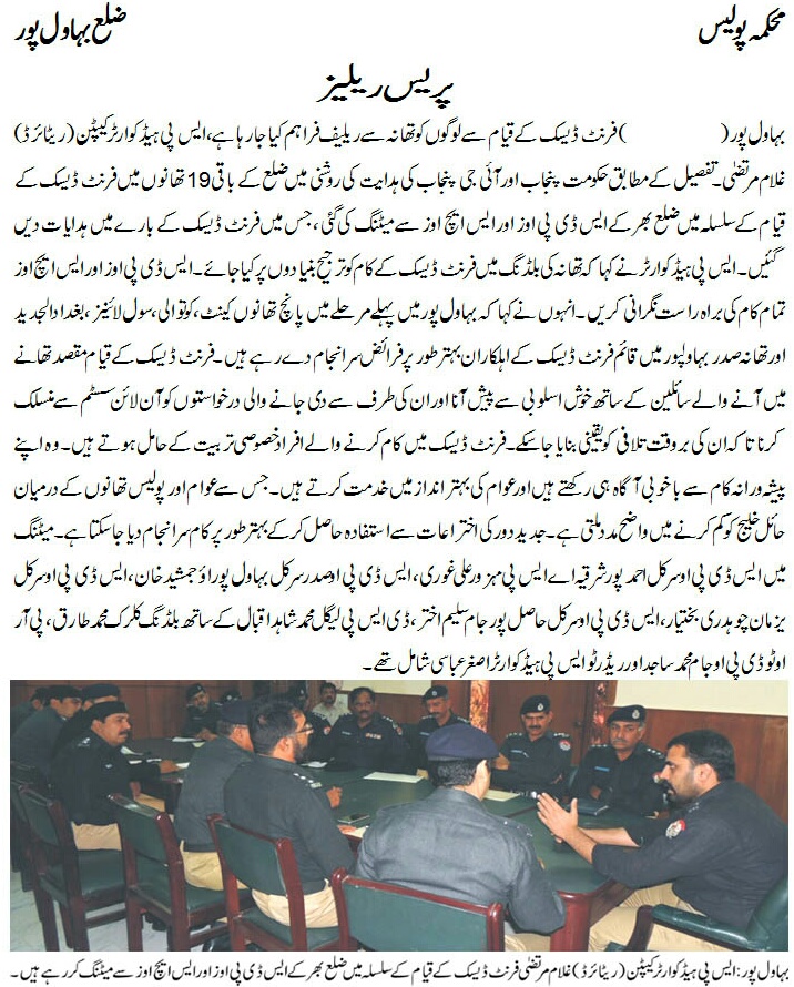 فرنٹ ڈیسک کے قیام سےلوگوں کو تھانہ سے ریلیف فراہم کیا جا رہا ہے۔ایس پی ھیڈ کواٹر کیپٹن (ریٹائرڈ ) غلام مرتضیٰ