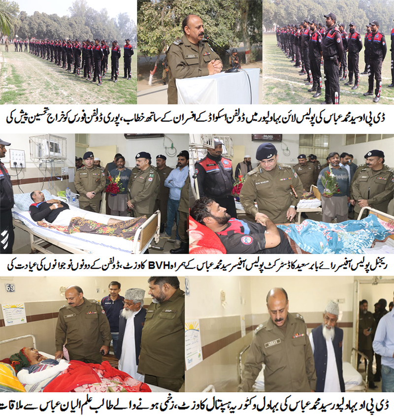 بہاولپور () ڈی پی او سید محمد عباس کی پولیس لائن بہاولپور میں ڈولفن اسکواڈ کے افسران کے ساتھ خطاب،ان کا حوصلہ بڑھایااور پوری ڈولفن فورس کوخراج تحسین پیش کی،ڈی پی او سید محمد عباس نے پوری ڈولفن اسکواڈکو کیش انعام اور تعریفی سرٹیفکیٹ کا اعلان کیا۔ آپ سب میرے دل کے بہت قریب ہیں آ پ کی فلاح و بہبود کا میں ذمہ دار ہوں،ڈی پی اوسید محمد عباس۔