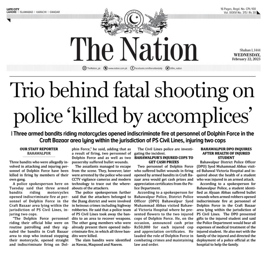 According to a spokesperson for Bahawalpur Police, District Police Officer (DPO) Bahawalpur Syed Muhammad Abbas visited Bahawal Victoria Hospital where he presented flowers to the two injured cops of Dolphin Force. He, on the occasion, announced cash prize Rs50,000 for each injured cop and appreciation certificates. He lauded the role of Dolphin Force in combating crimes and maintaining law and order.