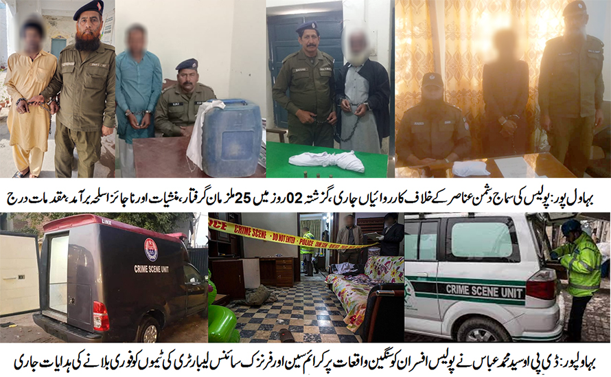 بہاول پور()پولیس کی سماج دشمن عناصر کے خلاف کارروائیاں جاری ،گزشتہ 02روز میں 25ملزمان گرفتار، منشیات اور ناجائزاسلحہ رکھنے والوں سے 02کلو سے زائد چرس،100گرام افیون ،470لیٹر دیسی شراب اور 03 پسٹل 30بور،01بندوق 12بوراور 01ریوالور32بور برآمد، مقدمات درج، دستیاب وسائل کو بروئے کارلاتے ہوئے معاشرے کو منشیات فروشوں سے پاک کیاجائے گا، ڈسٹرکٹ پولیس آفیسر سید محمد عباس۔