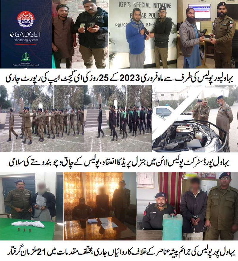 تفصیل کے مطابق ڈی پی او بہاولپور سید محمد عباس کا جدید آئی ٹی سہولیات کے استعمال پر زور دیا۔ڈی پی او بہاولپور سید محمد عباس کی ہدایت پر جرائم پیشہ افراد کی سرکوبی کا سلسلہ جاری ہے ۔ماہ فروری 2023کے پہلے 25روز میں بہاولپور پولیس نے ای گیجٹ کی مدد سے لاکھوں روپے مالیت کے 133موبائل فون ریکور کرکے اصل مالکان کے حوالے کیے ۔پنجاب پولیس کے ای۔گیجٹ ایپ کا استعمال موثر ثابت ہورہا ہے ۔ موبائل فون چوری یا چھین لیا جائے تو اس کو اب آسانی سے ریکور کیا جاسکتا ہے۔پنجاب پولیس نے ای گیجٹ نام کی موبائل ایپ متعارف کرائی ہے جسے آسانی سے پلے سٹور سے مفت ڈان کیا جا سکتا ہے، جس کے بعد کوئی بھی دکاندار اس کی مدد سے باآسانی جان سکے گا کہ اس کے پاس موجود موبائل فون جو کہ فروخت کرنے کیلئے آیا ہے کسی واردات میں ملوث یا چوری کا تو نہیں ہے جس بابت خدشہ ہونے یا یا علم ہونے کی صورت میں فوری متعلقہ پولیس کو اطلاع دی جاتی ہے دور حاضر میں پولیس کی جانب سے جدید ٹیکنالوجی کے استعمال سے کئی وارداتیں ٹریس کی جا رہی ہیں جو کہ معاشرے میں پولیس کے وقار کو مزید بلند کر رہا ہے