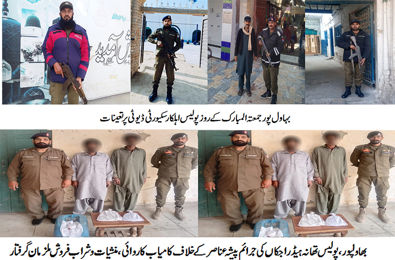 بھاولپور ( ) پولیس تھانہ ہیڈ راجکاں کی جرائم پیشہ عناصر کے خلاف کامیاب کاروائی، منشیات و شراب فروش ملزما ن گرفتار، 2200گرام چرس اور 28لیٹر برآمد، ملزمان پابند سلاسل ۔ عوام الناس کا خراج تحسین، جرائم پیشہ عناصر کے خلاف گھیرا مزید تنگ کیا جا رہا ہے، ڈی پی اوسید محمد عباس
