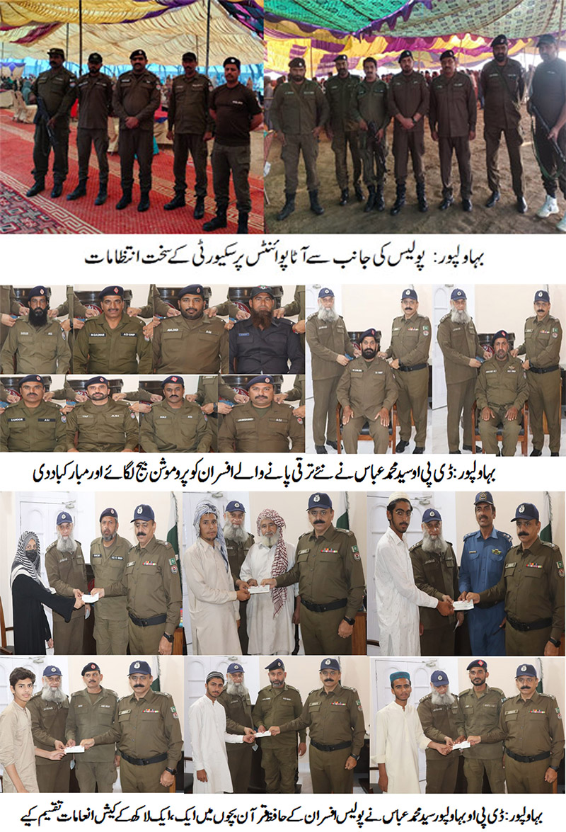 تفصیلات کے مطابق آئی جی پنجاب ڈاکٹر عثمان انور کی طرف سے پنجاب پولیس کے ویلفئیر کے اقدامات کا سلسلہ جاری ہے۔ تاکہ فورس کے اچھے کاموں کو سراہا جائے اور وہ فخر محسوس کریں کہ وہ پنجاب پولیس کا حصہ ہیں۔ اسی سلسلے کی ایک کڑی جس میں ڈی پی او بہاولپور سید محمد عباس نے پولیس افسران و جوانوں کے ان بچوں میں ایک، ایک لاکھ کے کیش انعامات تقسیم کیے جنہوں نے قرآن پاک حفظ کیا۔ ڈی پی او نے بچوں کو شاباش دی اور ان کے لیے نیک خواہشات کا اظہار کیا۔ جبکہ والدین کو بہترین تربیت اور نیک کام کرنے پر سراہا۔ ڈی پی او سید محمد عباس نے اس موقع پر بات کرتے ہوئے کہا کہ وہ والدین خوش قسمت ہیں جن کے بچے اللہ تعالی کے پاک کلام کو اپنے دلوں میں اتارتے ہیں۔ جس کا اجر بچوں کے ساتھ ساتھ انکے والدین کو بھی جاتا ہے جو ان کی نیک تربیت کرنے کے ذمہ دارا ہوتے ہیں۔ ڈی پی او نے مزید کہا کہ یہ آئی جی پنجاب جناب ڈاکٹر عثمان انور کی طرف اسے ایک تحفہ ہے تاکہ فورس کا مورال بلند ہو اور نیک نیتی سے اپنے فرائض سرانجام دیں۔ ڈی پی او نے آخر میں نیک خواہشات اظہار کرتے ہوئے کہا کہ اللہ تعالی آپکو اور آپکے بچوں کو قرآن پاک کی تعلیمات پر عمل کرنے کی توفیق عطا فرمائے۔ آمین