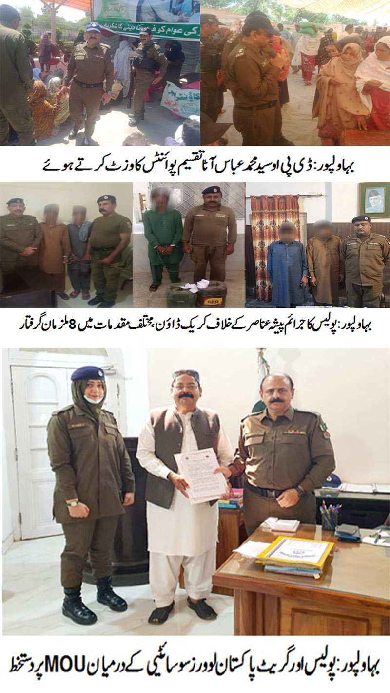 تفصیلات کے مطابق انسپکٹر جنرل آف پولیس پنجاب ڈاکٹر عثمان انور کے احکامات کی روشنی میں ڈسٹرکٹ پولیس آفیسر بہاولپور سید محمد عباس نے عوامی خدمت کے سلسلے کو جاری رکھتے ہوئے بہاولپور میں تحفظ سنٹر کا قیام عمل میں لایا تھا۔ ڈی پی او کے خصوصی احکامات پر پولیس خدمت مرکز بہاولپور میں تحفظ سنٹر قائم کیا گیا تھا۔ یہ تحفظ سنٹر ٹرانسجینڈر کمیونٹی سمیت معاشرے کے تمام کمزور و محکوم طبقات، بے گھر و بے سہارا بچوں ، ذہنی و جسمانی معذوری کے شکار افراد اور نشے و سماجی برائیوں میں پھنسے کم عمر بچوں کی بحالی ، تحفظ اور مشکلات کے ازالے کیلئے کام کر رہا ہے ۔ اس سلسلے میں ڈی پی او سید محمد عباس نے بہاولپور پولیس تحفظ سینٹر اور گریٹ پاکستان لورز سوسائٹی (این جی او)کے ساتھ تعاون کو مزید تقویت دینے اور باہمی شراکت کے ساتھ معاشرے کے ان نظر انداز طبقات کی فلاح و بہبود کیلئے مفاہمتی یادداشت پر دستخط کیے۔ گریٹ لورز سوسائٹی کے سربراہ نے نمائندگی کرتے ہوئے مفاہمتی یادداشت پر دستخط کیے اور مکمل تعاون کی یقین دہانی کرائی۔ ڈی پی او بہاولپور سید محمد عباس نے اس موقع پر بات کرتے ہوئے کہا کہ اس ایم او یو کے بعد سے بہاولپور پولیس تحفظ سینٹر ان اداروں اور متاثرہ و مدد کے مستحق افراد کیلئے ایک پل کا کام کرے گا۔ جس سے کسی بھی آنے والے سائل ، بچے ، نشے کے عادی افراد ، سماجی و معاشرتی طور پر نظر انداز افراد کو متعقلہ محکمہ یا این جی او کے سپرد کر کے تحفظ سینٹر کا نمائندہ اس کا فالواپ لے گا۔ تاکہ ان افراد کی فلاح و بہبود بہتر اور تیز ترین طور پر ہو سکے تاکہ ایسے افراد معاشرے میں اپنا ایک مثبت کردار ادا کر سکیں۔ مزید انہوں نے بتایا کہ این جی او وقتا فوقتا اگاہی مہم جاری رکھے گی اور ان نظر انداز طبقات کو شیلٹر مہیا کرے گی۔