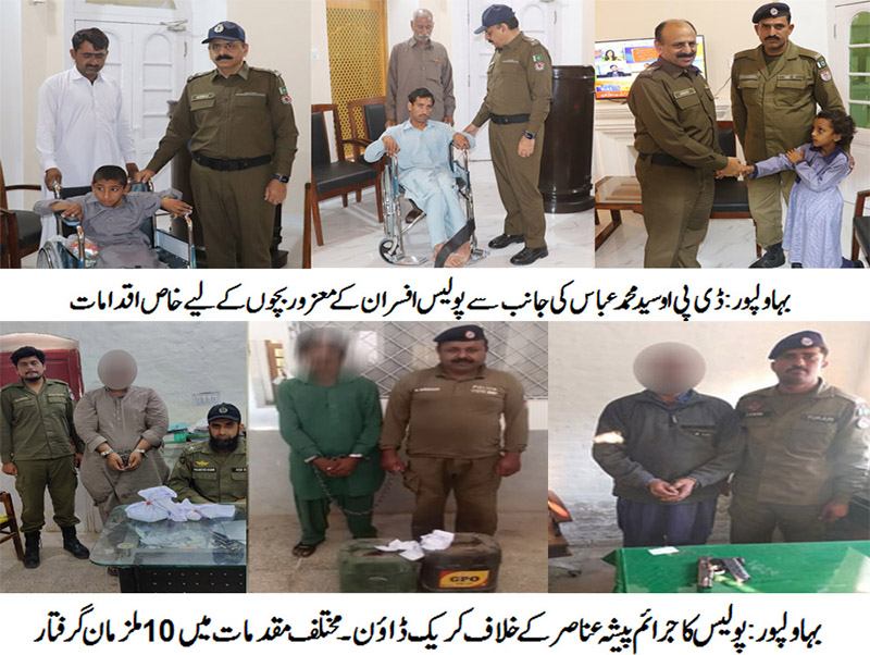 بہاولپور ( ) آئی جی پنجاب کے پولیس فورس کے ویلفئیر کے حوالے سے اقدامات، ڈی پی او بہاولپور سید محمد عباس نے بہاولپور پولیس کے افسران کے اسپیشل اور معذور بچوں کو ڈیجیٹل آلہ سماعت لگوائے اور وہیل چیئر تقسیم کیں۔ یہ ہمارے اپنے بچے ہیں ہر ممکن طور پر خیال رکھا جائے گا ۔ ڈی پی او سید محمد عباس