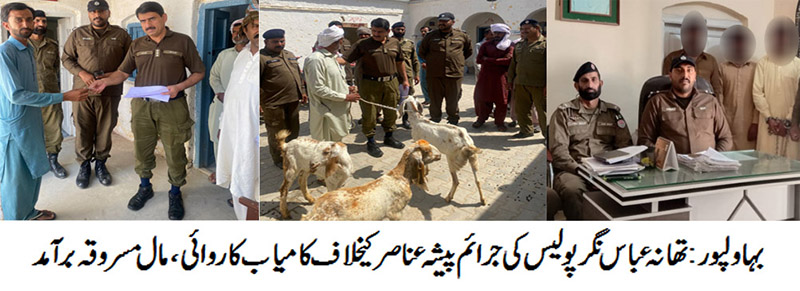 بہاولپور( ) ڈی پی او سید محمد عباس کی کمانڈ میں بہاولپور پولیس کو جرائم پیشہ عناصر کیخلاف کامیابیاں ملنے کا سلسلہ جاری۔ تھانہ عباس نگر پولیس کی مختلف کارروائیوں میں بھاری ریکوری، چوری شدہ 06عدد موٹر سائیکل، 29بکرے اور بکریاں اور اسلحہ ناجائز برآمد۔ ملزمان گرفتار، ایسی مزید کارروائیاں جاری رکھی جائیں گی اور عوام کا لوٹا ہوا مال ہر صورت واپس کروایا جائے گا۔ ڈی پی او سید محمد عباس