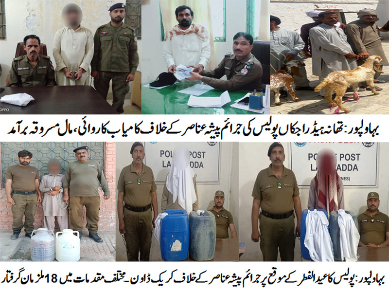 بہاولپور( )پولیس کا عید الفطر کے موقع پر جرائم پیشہ عناصر کے خلاف کریک ڈاون۔ مختلف مقدمات میں 18ملزمان گرفتار ۔330لیٹر دیسی و ولائیتی 190لیٹر شراب برآمد،01کلو گرام سے زائد چرس اور اسلحہ ناجائز بھی برآمد ، عید الفطر کے موقع پر شہریوں کی زندگیوں سے کھیلنے والے منفی عناصر کا بھر پور تعاقب کیا جائے گا۔ ڈی پی او سید محمد عباس