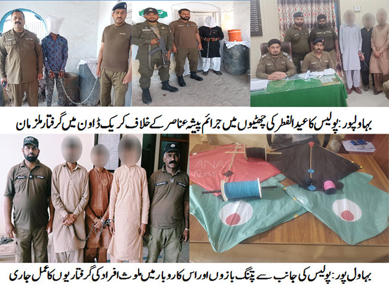 بہاولپور( )پولیس کا عید الفطرکی چھٹیوں میں جرائم پیشہ عناصر کے خلاف کریک ڈاون ۔ مختلف مقدمات میں28ملزمان گرفتار ۔420لیٹر لہن،951لیٹر دیسی شراب معہ 08عدد چالو بھٹیاں اور 50بوتلیں ولائیتی شراب برآمد،6280گرام چرس اور اسلحہ ناجائز بھی برآمد ، عید الفطر کے دنوں میں جب شہری اپنوں کے ساتھ عید کی خوشیاں منا رہے تھے تو بہاولپور پولیس عوام الناس کی جان و مال کی حفاظت پر مامور رہی۔ ڈی پی او سید محمد عباس