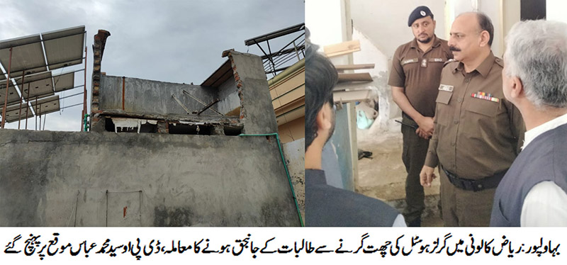 تفصیلات کے مطابق ریاض کالونی میں گرلز ہوسٹل کی چھت گرنے سے طالبات کے جانبحق ہوگئیں تھیں۔ ڈی پی او سید محمد عباس موقع پر پہنچ گئے۔ریاض کالونی میں گرلز ہاسٹل کی چھت گرنے سے دو طالبات شہلہ منور دختر محمد منور بعمری 21سالہ سکنہ چک 172مراد چشتیاں اور ماجدہ اقبال دختر محمد اقبال بعمری 21 سالہ سکنہ چک 172مراد چشتیاں جانبحق ہوگئیں جبکہ دو طالبات فائضہ دختر ظفر اقبال بعمری 19سالہ اور عائشہ نواز دختر محمد نواز 17سالہ کو زخمی حالت میں بہاول وکٹوریہ ہسپتال بہاولپور منتقل کر دیا گیا۔واقع پانی کی ٹینکی گرنے کی وجہ سے پیش آیا ۔ڈی پی او بہاولپور سید محمد عباس نے جائے وقوعہ پر پہنچ کر ایس ایچ او سول لائنز کو ذمہ داران کے خلاف قانون کے مطابق کارروائی کرنے کے احکامات دے دیئے ،سول لائنز پولیس نے ہاسٹل مالک سمیت اس واقعہ کے ذمہ داران کے خلاف قانونی کارروائی کا آغاز کر دیا۔ مزید تحقیقات جاری ہیں۔ ڈی پی او سید محمد عباس نے کہا کہ معصوم طالبات کی زندگیاں دا پر لگانے والے عناصر کو کسی صورت رعایت نہیں دی جائے گی۔