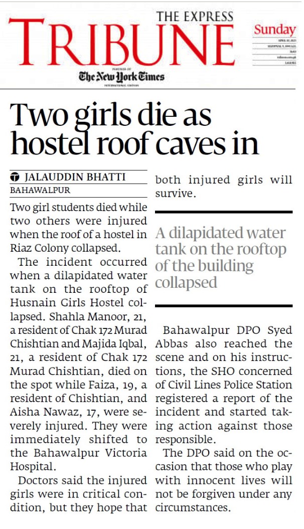 Two girl students died while two others were injured when the roof of a hostel in Riaz Colony collapsed. The incident occurred when a dilapidated water tank on the rooftop of Husnain Girls Hostel collapsed. Shahla Manoor, 21, a resident of Chak 172 Murad Chishtian and Majida Iqbal, 21, a resident of Chak 172 Murad Chishtian, died on the spot while Faiza, 19, a resident of Chishtian, and Aisha Nawaz, 17, were severely injured.