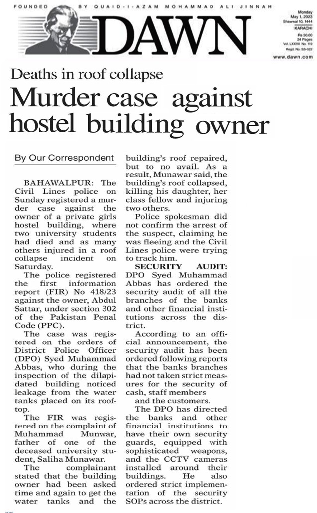 The police registered the first information report (FIR) No 418/23 against the owner, Abdul Sattar, under section 302 of the Pakistan Penal Code (PPC).The case was registered on the orders of District Police Officer (DPO) Syed Muhammad Abbas, who during the inspection of the dilapidated building noticed leakage from the water tanks placed on its rooftop.The FIR was registered on the complaint of Muhammad Munwar, father of one of the deceased university student, Saliha Munawar.The complainant stated that the building owner had been asked time and again to get the water tanks and the building’s roof repaired, but to no avail. As a result, Munawar said, the building’s roof collapsed, killing his daughter, her class fellow and injuring two others.Police spokesman did not confirm the arrest of the suspect, claiming he was fleeing and the Civil Lines police were trying to track him.