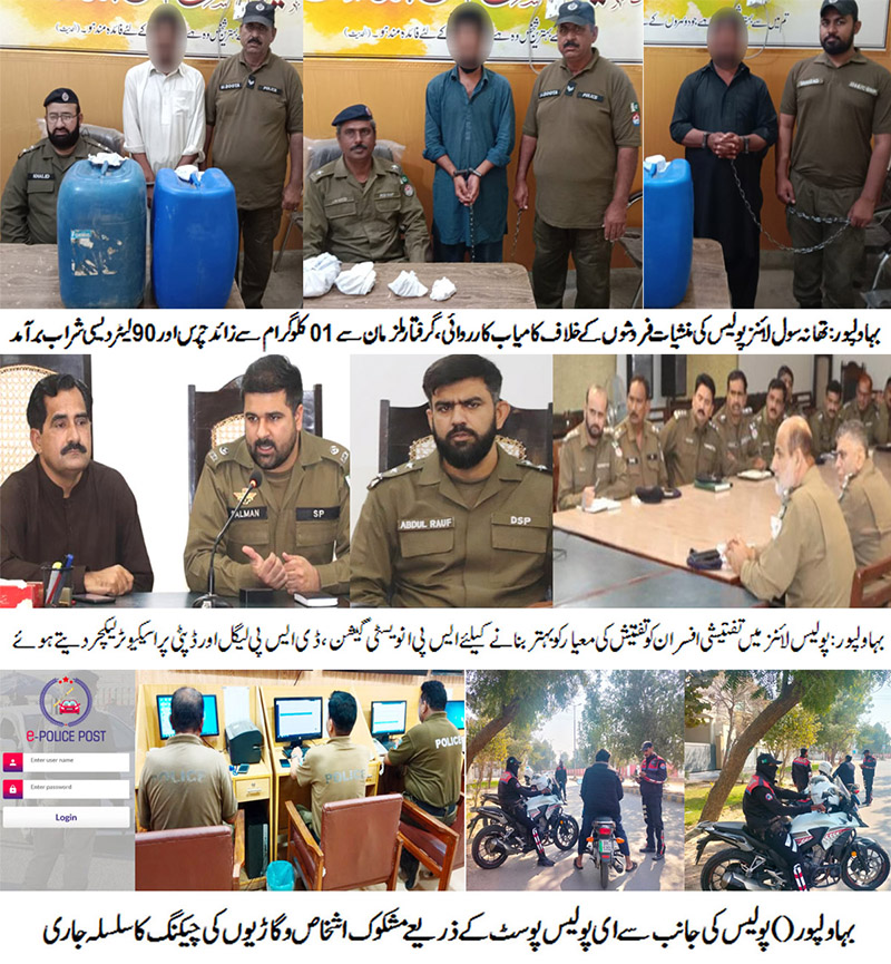 تفصیل کے مطابق ڈسٹرکٹ پولیس آفیسر بھاولپور سید محمد عباس کی ہدایت پر ایس ایچ او تھانہ سول لائنز نے ٹیم تشکیل دے کر منشیات فروشی کے خلاف کریک ڈان کیا۔ تھانہ سول لائنز پولیس ٹیم نے مخبر کی اطلاع پر ریاض کالونی کے بدنام زمانہ منشیات فروش محمد عمیر ولد مسرت شاہ عرف بنے شاہ کو گرفتار کر کے اس کے قبضہ سے 1320گرام چرس برآمد کر لی جبکہ دیگر کارروائیوں میں 2 شراب فروش ملزمان محمد رفیع اور عقیل احمد کو گرفتار کر کے انکے قبضہ سے 90لیٹر دیسی شراب برآمد کر لی۔گرفتار ملزمان کے خلاف علیحدہ علیحدہ مقدمات درج کرکے مزید تفتیش شروع کر دی۔ ڈی پی او بہاولپور سید محمد عباس نے ایس ایچ او سول لائنز اور ٹیم کو شاندار کارکردگی پر شاباش دی۔ اس موقع پر ڈی پی او سید محمد عباس نے اپنے پیغام میں کہا کہ منشیات فروشوں کے خلاف اسی طرح کارروائیاں جاری رکھتے ہوئے مزید موثر کارروائیاں عمل میں لائی جائیں تاکہ معاشرے کو ایسے ناسور عناصر سے پاک کیا جاسکے۔ منشیات جیسا زہر نوجوان نسل کی تباہی کا سبب ہے۔ جس کو ہر صورت روکا جائے گا۔