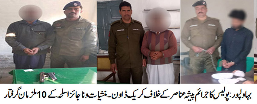 بہاولپور( )پولیس کا جرائم پیشہ عناصر کے خلاف کریک ڈاون۔گزشتہ روز مختلف مقدمات میں10ملزمان گرفتار۔ بھاری مقدار میں منشیات و ناجائز اسلحہ برآمد ۔معاشرتی جرائم کا خاتمہ ہی پرامن معاشرے کی بقا کی ضمانت ہے۔ ایسی مزید کارروائیاں جاری رکھتے ہوئے سماج دشمن عناصر کے خلاف بھرپور کریک ڈاون جاری رہے گا ۔ ڈی پی او سید محمد عباس