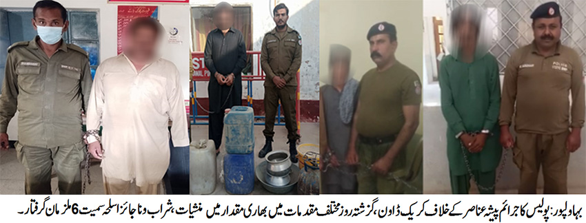 تفصیلات کے مطابق آئی جی پنجاب کی جرائم کی سرکوبی کیلئے جاری ہدایات پر عملدرآمد کو یقینی بناتے ہوئے ڈی پی او بہاولپور سید محمد عباس کی طرف سے جرائم پیشہ عناصر کے خلاف جاری مہم میں بڑی کامیابیاں ملنے کا سلسلہ جاری ہے۔ تھانہ کینٹ اور عباسنگر پولیس نے 03ملزمان اللہ نواز، محمد اکرم اور محمد اشفاق کو گرفتار کر کے قبضہ سے 03کلو 120گرام چرس برآمد کر لی۔ تھانہ صدر بہاولپور اور عنائیتی پولیس نے شراب فروشوں کے خلاف کارروائیاں عمل میں لاتے ہوئے 02ملزما ن محمد علی اور شاہد چنڑ کو گرفتار کرکے ان کے قبضہ سے 145لیٹر دیسی شراب و لہن 60لیٹر معہ01چالو بھٹی برآمد کرلی۔جبکہ تھانہ ہیڈراجکاں پولیس نے اسلحہ ناجائز رکھنے والوں کے خلاف کارروائی عمل میں لاتے ہوئے01ملزم ذوالفقار علی کو گرفتار کرکے اس کے قبضہ سے 01عدد رپیٹر 12بور برآمد کرلیا۔ گرفتار ملزمان کے خلاف علیحدہ علیحدہ مقدمات درج کر لیے گئے، ملزمان سے مزید تفتیش جاری ہے۔ اس موقع پر ڈی پی او بہاولپور سید محمد عباس نے اپنے پیغام میں کہا کہ ایسے گھناونے کام کرنے والے جرائم پیشہ افراد کے خلاف اسی طرح کریک ڈائون کرتے ہوئے مزید موثر کارروائیاں عمل میں لائی جائیں گی تاکہ معاشرے کو ایسے ناسور عناصر سے پاک کیا جاسکے۔عوام الناس کے جان و مال کا تحفظ یقینی بنانے کے لئے بھاولپور پولیس شب و روز مصروف عمل ہے۔ معاشرتی جرائم کا خاتمہ ہی پرامن معاشرے کی ضمانت ہے۔