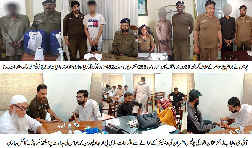 پولیس کی جرائم پیشہ عناصر کے خلاف گذشتہ 20 روز کی کارکردگی ، 259 اشتہاری مجرمان سمیت 452 ملزمان گرفتار،بھاری مقدار میں منشیات اور غیرقانونی اسلحہ برآمد، مقدمات درج ۔ضلع میں جرائم پیشہ عناصر کا قلع قمع کرنے کا تہیہ کیا ہوا ہے، معاشر ے کو ایسے عناصر سے پاک کیا جائے گا، ڈی پی او سید محمد عباس