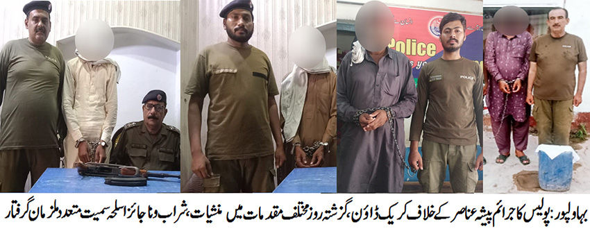 بہاولپور( )پولیس کا جرائم پیشہ عناصر کے خلاف کریک ڈاون۔گزشتہ روز مختلف مقدمات میں متعدد ملزمان گرفتار۔ بھاری مقدار میں منشیات ، شراب و ناجائز اسلحہ برآمد ۔ ناجائز اسلحہ کے ذریعے دہشت پھیلانے والوں اور منشیات کے کاروبار میں ملوث افراد کا محاصرہ جاری رہے گا۔ ڈی پی او سید محمد عباس