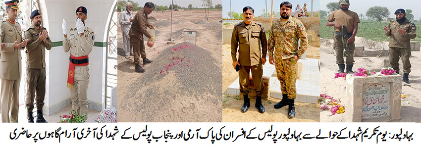 یوم تکریم شہدا کے حوالے سے بہاولپور پولیس کے افسران کی پاک آرمی اور پنجاب پولیس کے شہدا کی آخری آرام گاہوں پر حاضری، درجات کی بلندی کیلئے دعائیں کیں۔شہدا پاکستان کا فخر ہیں جو عوام کے دلوں میں ہمیشہ زندہ رہیں گے ۔شہید ہمارا قیمتی سرمایہ ہیں ،ڈی پی او سید محمد عباس
