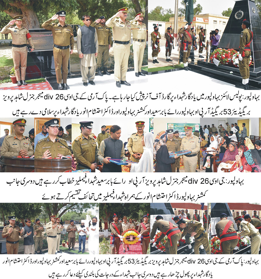 تفصیل کیمطابق آرپی او رائے بابر سعید نے شہدا کو خراج تحسین پیش کرنے کیلئے یوم تکریم شہدا کے حوالے سے پولیس لائنز بہاولپور میں ایک تقریب کا انعقاد کیا۔ یوم تکریم شہدا کے موقع پر پولیس لائنز بہاولپور میں یاد گار شہدا پر گارڈ آف آنر پیش کیا گیااور شہدا کے درجات کی بلندی کیلئے دعا کی گئی۔پاک آرمی کے جی او سی26div میجر جنرل شاہد پرویز، بریگیڈیئر 53بریگیڈ،آر پی او بہاولپور رائے بابر سعید اور کمشنر بہاولپور اور ڈاکٹر احتشام انور نے یادگار شہدا پر پھول چڑھائے۔اس موقع پر ڈپٹی کمشنر ظہیر انورجپہ اور ایس پی انوسٹی گیشن سلمان لیاقت بھی موجود تھے۔اس تقریب میں شہدا پولیس کی فیملیز نے بھی شرکت کی۔جی او سی 26 div میجر جنرل شاہد پرویز نے تقریب کے دوران خطاب کرتے ہوئے کہا کہ 25 مئی کا دن قوم کا شہدا کو خراج عقیدت پیش کرنے کادن ہے،افواج پاکستان ملک کا دفاع جبکہ پولیس پورے پاکستان میں شہریوں کے عزت،جان و مال کی حفاظت کر رہی ہے۔افواج پاکستان کے شہدا نے مادر وطن کی حفاظت کیلئے اپنی جانیں قربان کردیں،اس مقصد کیلئے پولیس کے بھی بہت سے جوان شہید ہوئے۔شہدا افواج نے دشمنوں کے پروپیگنڈے اورمنصوبوں کو ناکام بنایا،ہم اپنے شہدا کی قربانیوں کو کبھی فراموش نہیں کرسکتے،میں اپنے ان جوانوں کو سلام پیش کرتا ہوں جنہوں نے ملک و قوم کی بقا کیلئے اپنی فیملیز کی پرواہ نہ کرتے ہوئے اپنی جانوں کا نذرانہ پیش کیا۔آرپی او بہاولپور رائے بابر سعید نے گفتگو کرتے ہوئے کہا کہ شہدا ہماراسرمایہ ہیں چاہے وہ افواج پاکستان کے ہوں یا پولیس کے،ان کی لازوال قربانیوں کو ہمیشہ سنہری الفاظ میں یاد رکھا جائے گا۔ پاکستان کے نظریات کو برقرار رکھنے کیلئے جانیں نچھاور کرنے والے،شہدا پاکستان ہمارے ہیرو ہیں۔اس دن کو منانے کا مقصد شہدا کی لازوال قربانیوں کی یاد تازہ کرنا ہے۔ ہم یہ پیغام دینا چاہتے ہیں کہ شہدا اور ان کی فیملیز پاکستان کا فخر ہیں،یقینا بہت سی ماں نے اپنے بیٹے،بہنوں نے اپنے بھائی اور بیٹیوں نے اپنے باپ کھود ئیے ہیں جن کا ازالہ کبھی نہیں کیا جا سکتا آئیے آج ہم سب ملکر یہ عہد کریں کہ ہم اپنے شہدا کواچھے الفاظ میں نہ صرف یاد رکھیں گے بلکہ انہیں ہمیشہ عزت و تکریم دیں گے۔تقریب کے اختتام پر پاک آرمی کے جی او سی 26 div میجر جنرل شاہد پرویز، بریگیڈیئر 53 بریگیڈ،آر پی او بہاولپور رائے بابر سعید اور کمشنر بہاولپور اور ڈاکٹر احتشام انور نے شہدا پولیس کی فیملیز میں تحائف تقسیم کئے۔آرپی او بہاولپور رائے بابر سعید فوج کے شہید کیپٹن سلمان فاروق لودھی اور حوالدار سخاوت حسین کے گھر بھی گئے ان کی فیملیز سے ملاقات کی،پھولوں کے گلدستے اور تحائف دئیے۔