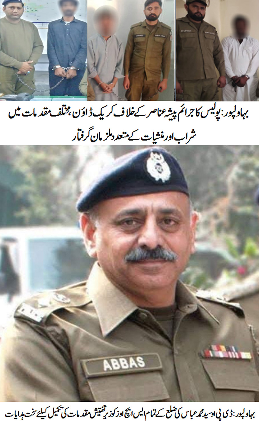 بہاولپور( )پولیس کا جرائم پیشہ عناصر کے خلاف کریک ڈاون۔گزشتہ روز مختلف مقدمات میں متعدد ملزمان گرفتار۔ گرفتار ملزمان سے شراب اور منشیات برآمد۔ جرائم پیشہ افراد کا تعاقب جاری رکھا جائیگا ۔ ڈی پی او سید محمد عباس