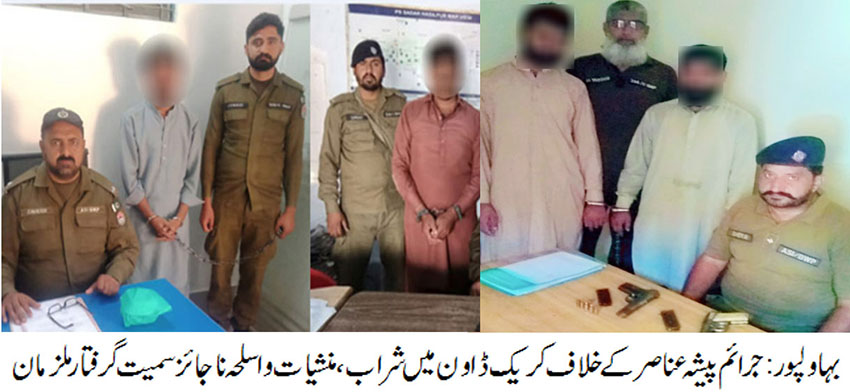 تفصیلات کے مطابق آئی جی پنجاب کی جرائم کی سرکوبی کیلئے جاری ہدایات پر عملدرآمد کو یقینی بناتے ہوئے ڈی پی او بہاولپور سید محمد عباس کی طرف سے جرائم پیشہ عناصر کے خلاف جاری مہم میں بڑی کامیابیاں ملنے کا سلسلہ جاری ہے۔تھانہ سول لائینز، تھانہ صدر بہاول پور ، تھانہ عباس نگر، تھانہ سمہ سٹہ پولیس نے شراب فروشوں کے خلاف کاروائیاں کرتے ہوئے ملزمان ہارون الرشید، مظفر نعیم، محمد اعجاز اور محمد سیفل کو گرفتار کر کے ان کے قبضہ سے 200لیٹر دیسی شراب، 200لیٹر لہن اور چالو بھٹی برآمد کرلی جبکہ تھانہ صدر بہاول پور پولیس نے منشیات فروشی کے خلاف کارروائی عمل میں لاتے ہوئے ملزم غلام حسین عرف کالا کو گرفتار کر کے اس کے قبضہ سے لاکھوں روپے مالیتی 2400گرام ہیروئن برآمد کر لی۔ تھانہ صدر بہاول پور ، تھانہ ڈیرہ نواب صاحب پولیس نے دوران انٹیروگیشن گرفتار ملزمان غلام حسین عرف کالا، غلام مصطفی اور وقار انجم کی نشاندہی پر ریڈ کر کے 03 عدد پسٹل 30بور برآمد کرلئے۔گرفتار ملزمان کے خلاف علیحدہ علیحدہ مقدمات درج کر لیے گئے، ملزمان سے مزید تفتیش جاری ہے۔ اس موقع پر ڈی پی او بہاولپور سید محمد عباس نے اپنے پیغام میں کہا کہ ایسے گھناونے جرائم کرنے والے جرائم پیشہ افراد کے خلاف اسی طرح کریک ڈان کرتے ہوئے مزید موثر کارروائیاں عمل میں لائی جائیں گی تاکہ معاشرے کو ایسے ناسور عناصر سے پاک کیا جاسکے۔ انہوں نے مزید کہا کہ معاشرے میں بدامنی پھیلانے والے افراد کو کیفر کردار تک پہنچایا جائے گا۔