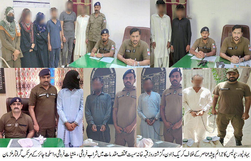 تفصیلات کے مطابق آئی جی پنجاب کی جرائم کی سرکوبی کیلئے جاری ہدایات پر عملدرآمد کو یقینی بناتے ہوئے ڈی پی او بہاولپور سید محمد عباس کی طرف سے جرائم پیشہ عناصر کے خلاف جاری مہم میں بڑی کامیابیاں ملنے کا سلسلہ جاری ہے۔تھانہ سٹی حاصل پور پولیس نے قحبہ خانے سے 05 ملزمان کو گرفتار کر لیا۔تھانہ سول لائینز، تھانہ عباس نگر، تھانہ سٹی یزمان پولیس نے منشیات فروشوں کے خلاف کاروائیاں کرتے ہوئے ملزمان بہادر ، محمد ساجد عرف کھڑکنا، ارشد بشیر عرف للی اور محمد اقبال کو گرفتار کر کے ان کے قبضہ سے 3760گرام چرس برآمد کرلی جبکہ تھانہ صدر حاصل پور پولیس نے شراب فروشی کے مرتکب محمد عباس کو گرفتار کرکے اس کے قبضہ سے 60لیٹر دیسی شراب برآمد کرلی۔اسی طرح اسلحہ ناجائز رکھنے والوں کے خلاف گھیرا تنگ کرتے ہوئے تھانہ صدر بہاول پور ،تھانہ عباس نگر، تھانہ سمہ سٹہ، تھانہ مسافر خانہ اور تھانہ سٹی حاصل پور پولیس نے ملزمان محمد ساجد حسین، محمد شاکر، محمد نادر، محمد الیاس، محمد اجمل عرف اجو، علی رضا اور محمد زاہد کو گرفتار کرکے ان کے قبضہ سے 06عدد پسٹل 30بور اور 01عدد کاربین برآمد کرلی۔گرفتار ملزمان کے خلاف علیحدہ علیحدہ مقدمات درج کر لیے گئے، ملزمان سے مزید تفتیش جاری ہے۔ اس موقع پر ڈی پی او بہاولپور سید محمد عباس نے اپنے پیغام میں کہا کہ ایسے گھنانے جرائم کرنے والے جرائم پیشہ افراد کے خلاف اسی طرح کریک ڈان کرتے ہوئے مزید موثر کارروائیاں عمل میں لائی جائیں گی تاکہ معاشرے کو ایسے ناسور عناصر سے پاک کیا جاسکے۔ انہوں نے مزید کہا کہ معاشرے میں بدامنی پھیلانے والے افراد کو کیفر کردار تک پہنچایا جائے گا۔