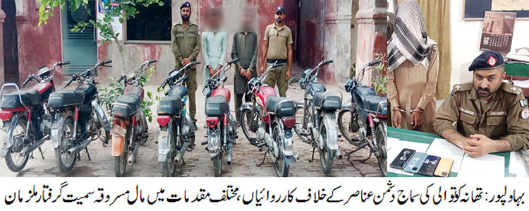 تفصیلات کے مطابق آئی جی پنجاب ڈاکٹر عثمان انور کی ہدایات کی روشنی میں جرائم پیشہ عناصر کے خلاف جاری مہم کے تحت ڈی پی او بہاولپور سید محمد عباس کی کمانڈ میں بڑی کامیابیاں ملنے کا سلسلہ جاری ہے۔ اسی سلسلے کو جاری رکھتے ہوئے تھانہ کوتوالی پولیس نے گزشتہ دنوں میں شب و روز کی محنت، جدید ٹیکنالوجی و پریکٹیکل پولیسنگ کرتے ہوئے موٹر سائیکل چور گینگ گرفتار کر لیا، جن سے لاکھوں روپے مالیت کے 8عدد موٹر سائیکل برآمد ہوئے، جو بہاولپور پولیس کے مختلف علاقوں سے چوری ہوئے تھے۔ گرفتار ملزمان میں امتیاز اور یسین شامل ہیں ۔ ملزمان سے ماسٹر کیی اور مختلف نمبر پلیٹیں بھی برآمد ہوئیں۔اسی طرح موٹر سائیکل چور گینگ کے گرفتار ملزم امتیازکے انکشاف پر دوران انٹیروگیشن تقریبا ڈیڑھ لاکھ روپے مالیت کے 04عدد موبائل فون برآمد کرلئے۔ ڈی پی او بہاولپور سید محمد عباس نے اپنے پیغام میں کہا کہ بہاولپور پولیس بھر پور کوشش کرتے ہوئے اس بات کو یقینی بنا رہی ہے کہ عوام کا لوٹا ہوا مال ہر صورت مالکان تک پہنچایا جائے تاکہ شہر میں امن کی فضا برقرار رہے اور عوام کا پولیس پر اعتماد قائم رہے۔ مستقبل میں ایسی مزید کارروائیاں کی جاکر جرائم پیشہ افراد کو ان کے منطقی انجام تک پہنچایا جائے گا ۔ ڈی پی او سید محمد عباس نے بہترین کارکردگی پر تھانہ کوتوالی پولیس کو شاباش دی۔