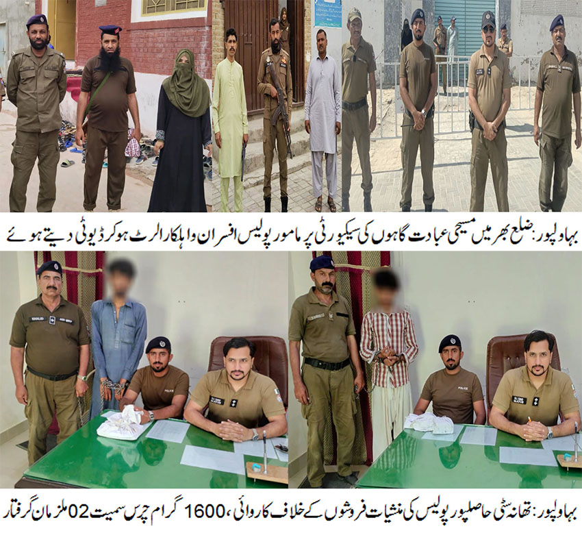 تفصیلات کے مطابق آئی جی پنجاب ڈاکٹر عثمان انور کی طرف سے جرائم پیشہ عناصر کے خلاف جاری مہم کے تحت ڈی پی او بہاولپور سید محمد عباس کی کمانڈ میں بڑی کامیابیاں ملنے کا سلسلہ جاری ہے۔ڈسٹرکٹ پولیس آفیسر سید محمد عباس نے پولیس پریکٹیکل ورک پر زور دیا اور منشیات فروشوں کے خلاف بھر پور کارروائی کے احکامات جاری کیے، اسی سلسلے کو جاری رکھتے ہوئے تھانہ سٹی حاصلپور پولیس نے منشیات فروشوں کے خلاف کارروائی کرتے ہوئے 02ملزمان محمد عمران اور معین الدین کو گرفتار کرکے قبضہ سے 1600گرام چرس برآمد کرلی۔ سٹی حاصلپور پولیس نے علیحدہ علیحدہ مقدمات درج کر کے تفتیش شروع کر دی۔ ڈی پی او بہاولپور سید محمد عباس نے اپنے پیغام میں کہا کہ منشیات فروشی جیسے گھنانے کاروبار کو ہر صورت بہاولپور سے ختم کر کے دم لیں گے تاکہ نوجوان نسل کو تباہی سے بچایا جا سکے۔ انہوں نے کہا کہ مستقبل میں بھی ایسی مزید کارروائیاں کی جاکر جرائم پیشہ افراد کو ان کے منطقی انجام تک پہنچایا جائے گا۔ ڈی پی او نے بہترین کارکردگی پر تھانہ سٹی حاصلپور پولیس کو شاباش دی۔