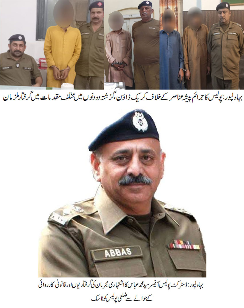 تفصیل کے مطابق انسپکٹر جنرل آف پولیس پنجاب اور ایڈیشنل انسپکٹر جنرل آف پولیس جنوبی پنجاب کی مفرور ملزمان کی گرفتاریوں کے حوالے سے مہم کے تحت ڈسٹرکٹ پولیس آفیسر سید محمد عباس نے بہاولپور کے تمام تھانوں کو پرانے مقدمات میں ملوث ملزمان ، اشتہاری مجرمان کی گرفتاریوں اور ان کے خلاف ضابطہ کی کارروائیاں کرنے کا ٹاسک دے دیا،ان کی فہرستیں تیار کی جائیں اور تکنیکی وسائل کو بروئے کار لاتے ہوئے گرفتار کر کے قانون کے کٹہرے میں لایا جائے۔ آئی ٹی کی ٹیمیں تھانوں کی سطح پر تفتیشی افسران سے تعاون کر کے ملزمان کی نقل و حرکت کا تعین کریں اور ہر ممکن وسائل کو انویسٹی گیشن اور آپریشن میں استعمال کیا جائے، میں روزانہ کی بنیاد پر تمام ضلع کے تھانوں کی پراگرس چیک کروں گا اور جن کی پرفارمنس میں کمی ہوئی ان کو اس کا جواب دینا پڑے گا اور اچھی پرفارمنس والے افسران کو سرٹیفکیٹس اور انعامات تقسیم کیے جائیں گے۔ وہی آفیسر تھانے میں تعینات رہنے کا اہل ہوگا جس کی کارکردگی نمایاں ہوگی۔ کمیونٹی پولیسنگ کے ساتھ ساتھ جرائم پر قابو پانا اور ملوث ملزمان کو گرفتار کرنا ہماری ہر اول ڈیوٹی ہے۔ شہریوں کی داد رسی اس صورت میں ہو سکتی ہے جب ہم ان کے جان و مال کا نقصان کرنے والے افراد کو آہنی ہاتھوں سے نمٹیں گے، ان خیالات کا اظہار ڈی پی او سید محمد عباس نے بہاولپور پولیس کے افسران کو جاری ہدایات میں کیا۔