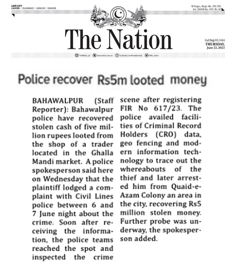 BAHAWALPUR   -    Bahawalpur police have recovered stolen cash of five mil­lion rupees looted from the shop of a trader located in the Ghalla Mandi market. A police spokesperson said here on Wednesday that the plaintiff lodged a com­plaint with Civil Lines police between 6 and 7 June night about the crime. Soon after re­ceiving the informa­tion, the police teams reached the spot and inspected the crime scene after registering FIR No 617/23. The police availed facili­ties of Criminal Record Holders (CRO) data, geo fencing and mod­ern information tech­nology to trace out the whereabouts of the thief and later arrest­ed him from Quaid-e-Azam Colony an area in the city, recovering Rs5 million stolen money. Further probe was un­derway, the spokesper­son added.